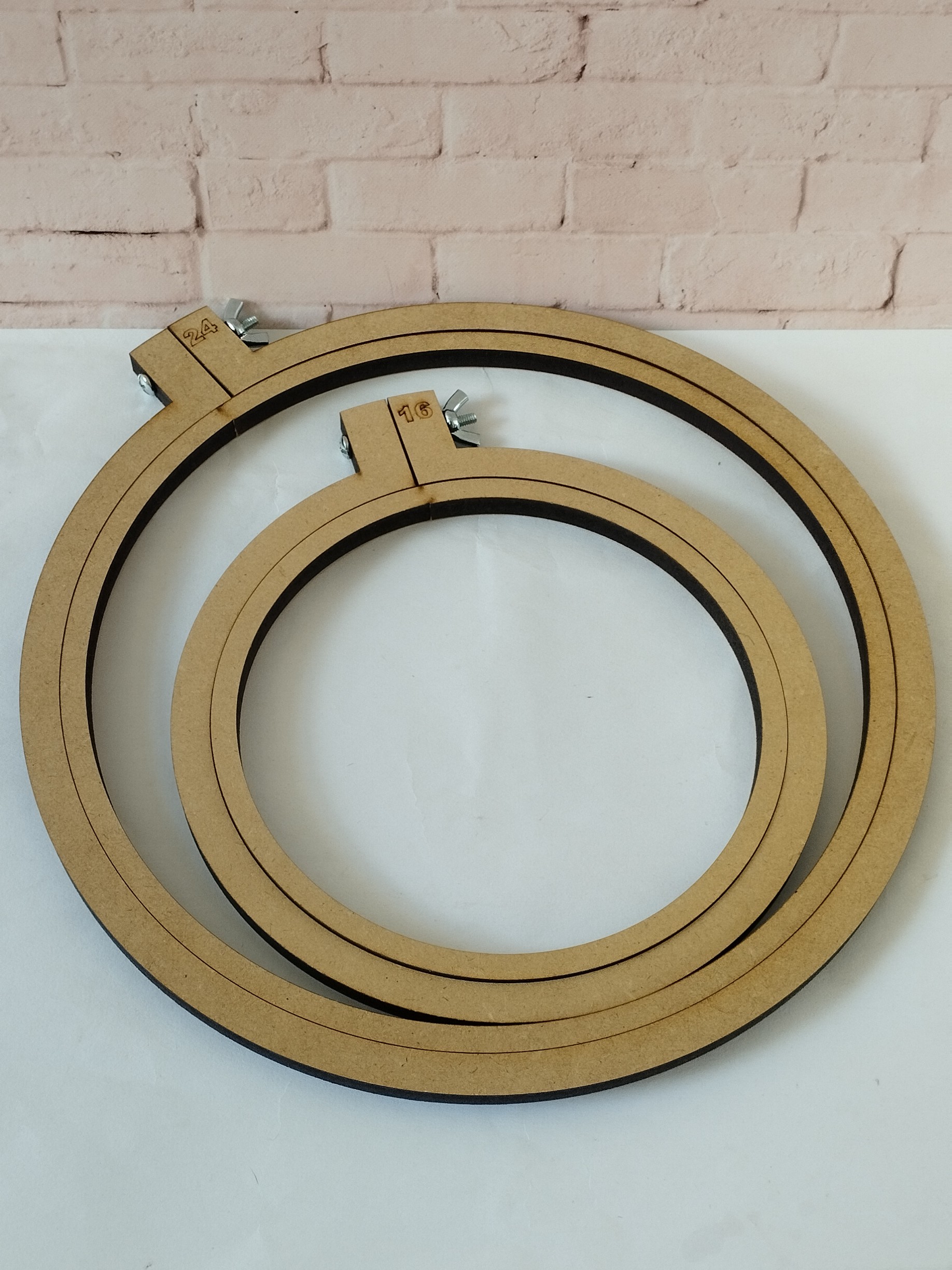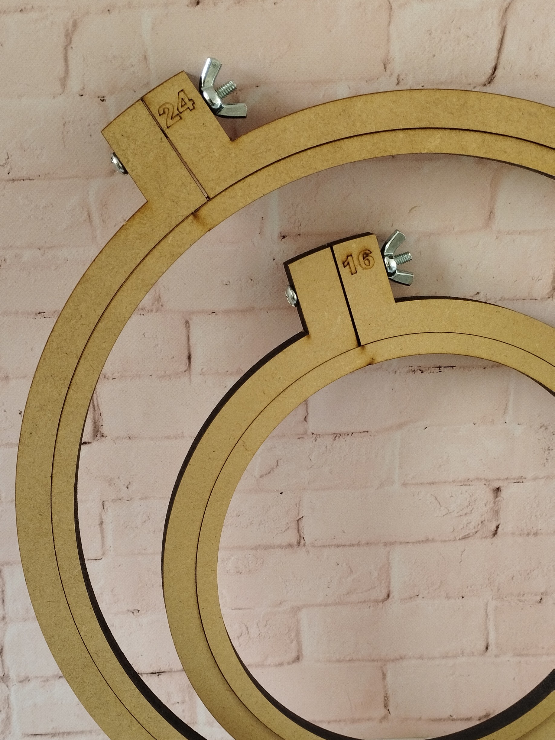 Bastidores para bordado. Están construidos en fibrofácil reforzado (1 cm de espesor). La llave para ajustar es de metal.